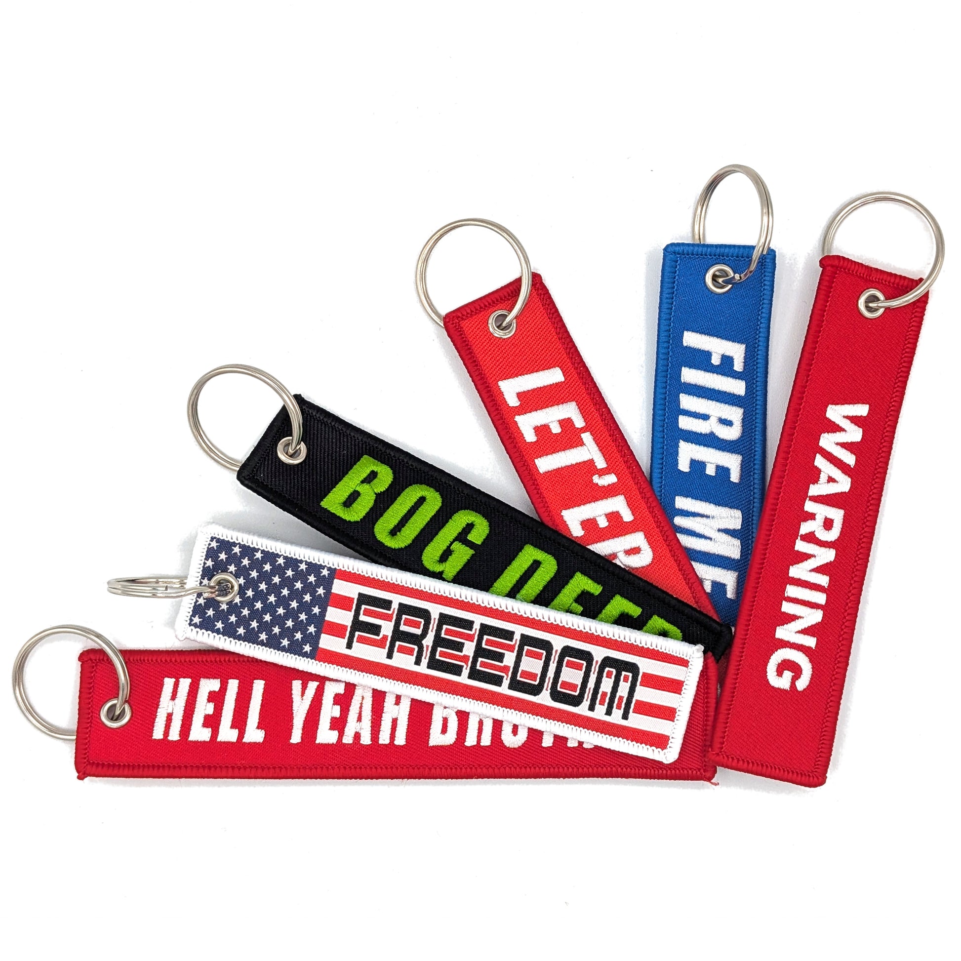 We now have six new Cleetus keytags!! Bog Deep, Leter Rip, Hell Yeah Brother, Fire Me Up or either one of our 2 new designs: Warning or Freedom!! Each Keychain is lightweight, durable, and embroidered with a freedom-inspired saying!!