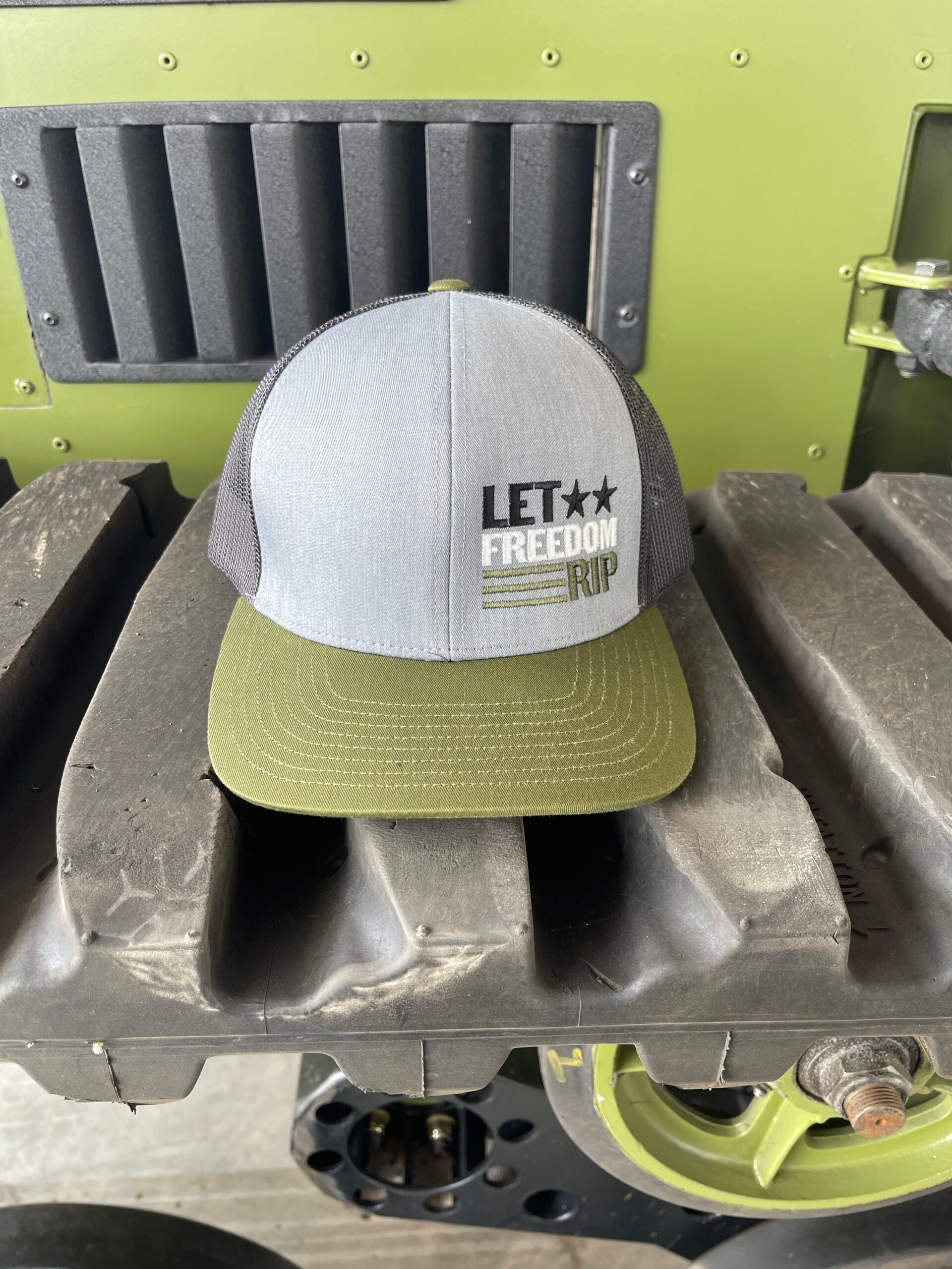 Green and Gray hat with embroidered saying "Let Freedom Rip"