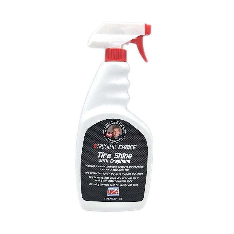 Sam Sez Truckers Choice Tire Shine Spray is formulated with Graphene and acrylic polymers, giving your tires an extreme long lasting non-sling glossy finish. Simply spray on tire and walk away. Graphene and acrylic polymers create a long-lasting shine and protection while preventing cracking and fading caused by harmful elements to make your tires last longer and look better. Truckers Choice tire shine last for weeks not days.