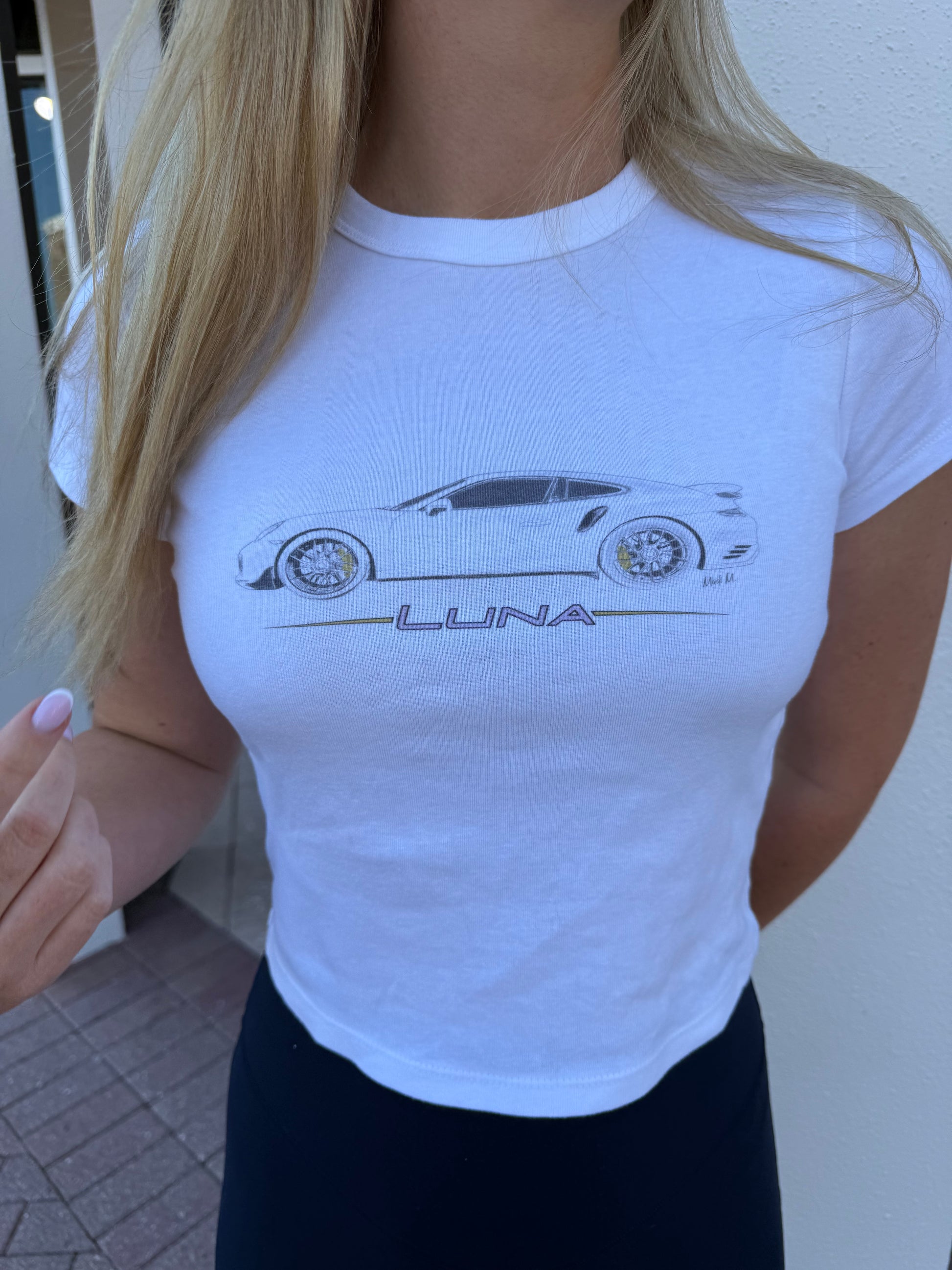 Created by Madi herself. Get our first ever trendy micro rib baby tee with her favorite car of the fleet, Luna